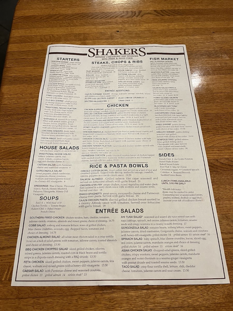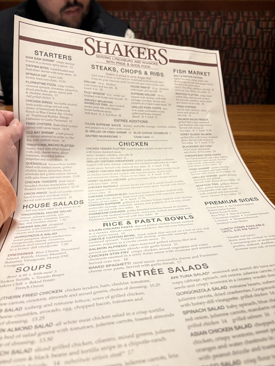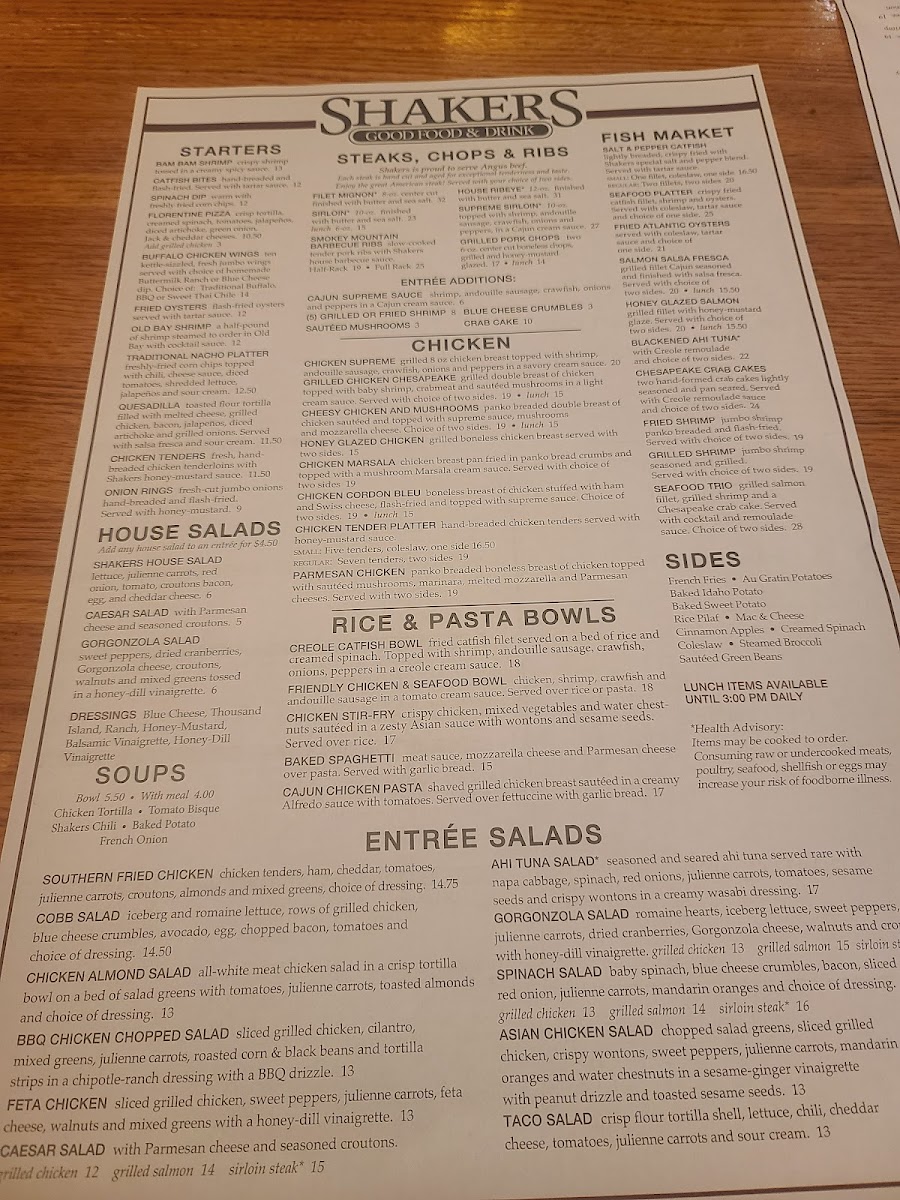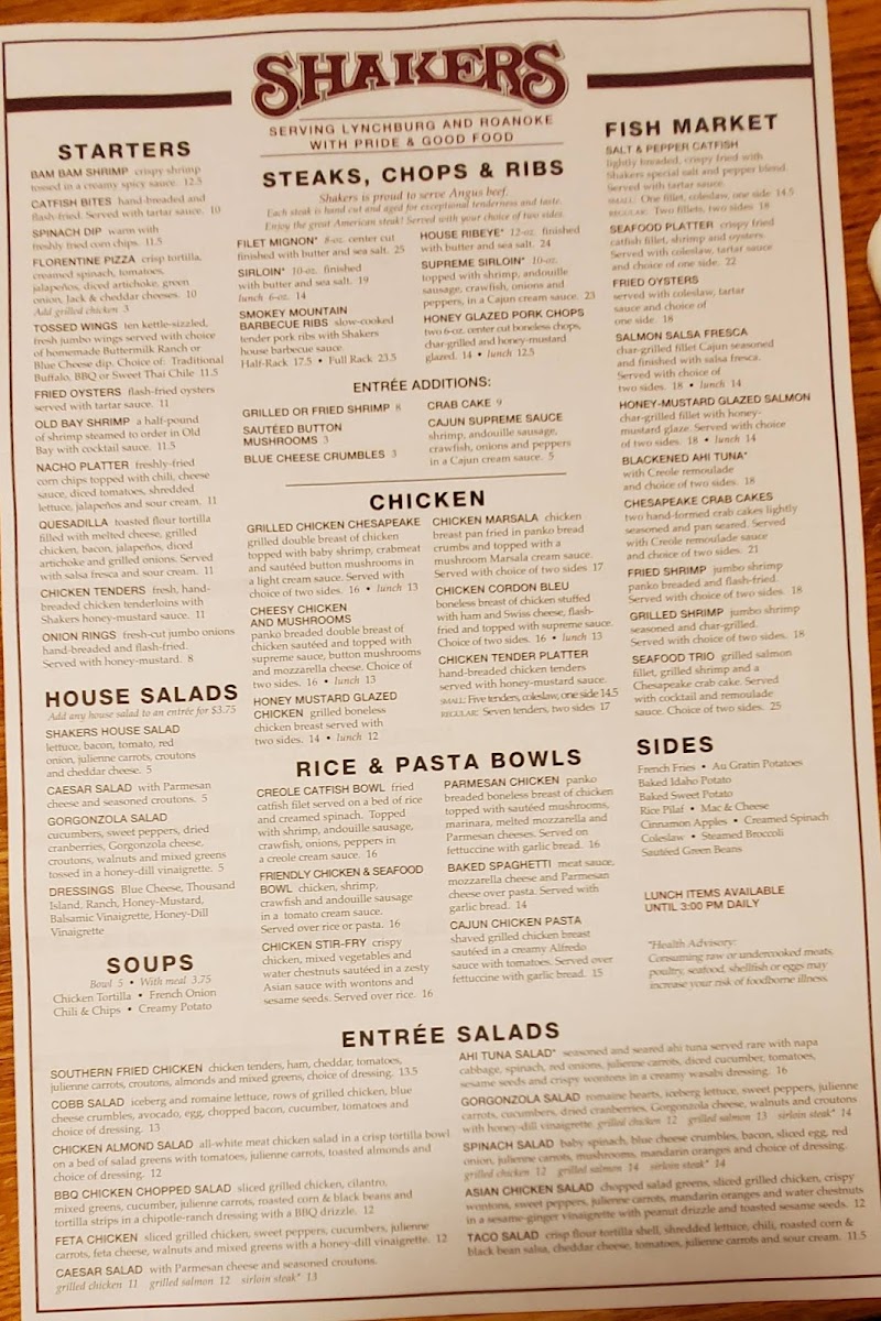 Welcome to Shakers Restaurant in Lynchburg, a culinary gem nestled at 3401 Candlers Mountain Rd. This vibrant eatery offers an enticing menu that blends Southern flavors with innovative flair. Starters like the crispy Bam Bam Shrimp and hand-breaded Catfish Bites are perfect for sharing, while the warm Spinach Dip is a crowd favorite. Their Cantina Tacos are not to be missed—enjoy the delicious Fry Fish Tacos or the hearty Southwest Chicken Tacos, each bursting with fresh ingredients.